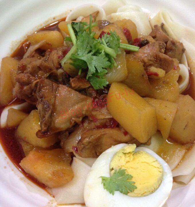 これは大盤鶏(ダーパンジー)と呼ばれる料理をゆでた麺にかけたものです。
