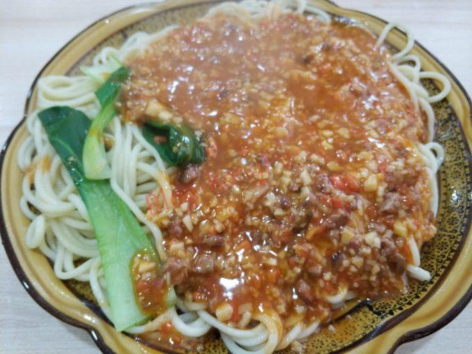 味は日本で食べるミートソースとは少し違って片栗の量が多めで、あんかけうどんみたいな感じです。