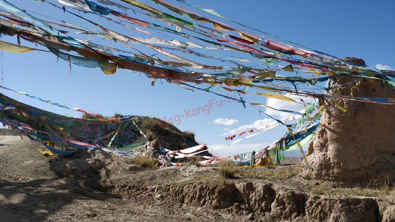 だいぶ高いところまで来ました。斜面にはためくタルチョが美しいですね。