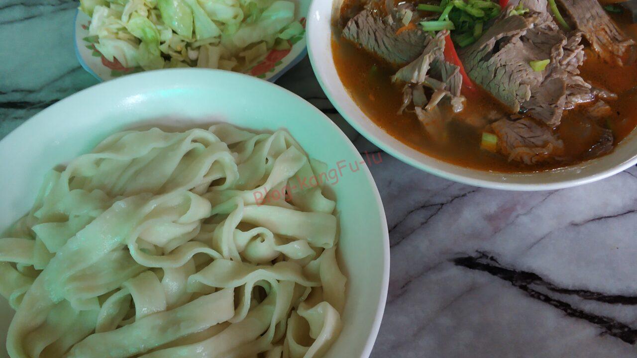 牛肉たっぷりのスープに幅広麺をつけて食べます。キャベツの酢漬け付きです。
