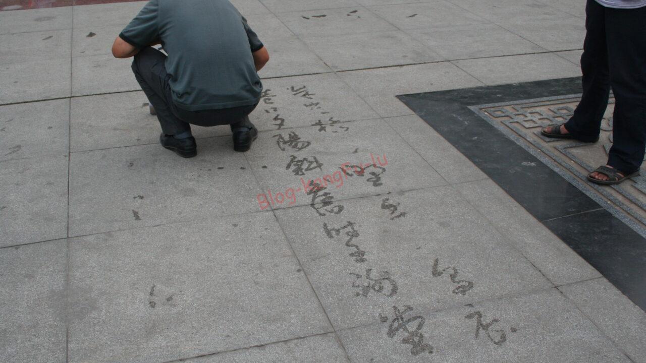 公園にはたいていこのように水筆で地面に字を書いている人がいます。みな達筆です。
