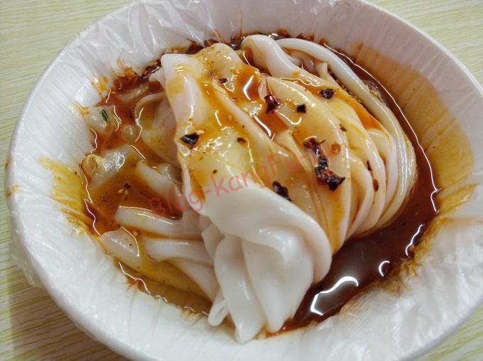 米粉を練って麺よりも薄く伸ばしたものを蒸籠で蒸したもので、細長い状態のものをたたんで器にあけ、もやしやホウレン草をあえ、酢とラー油と絡めて食べます。