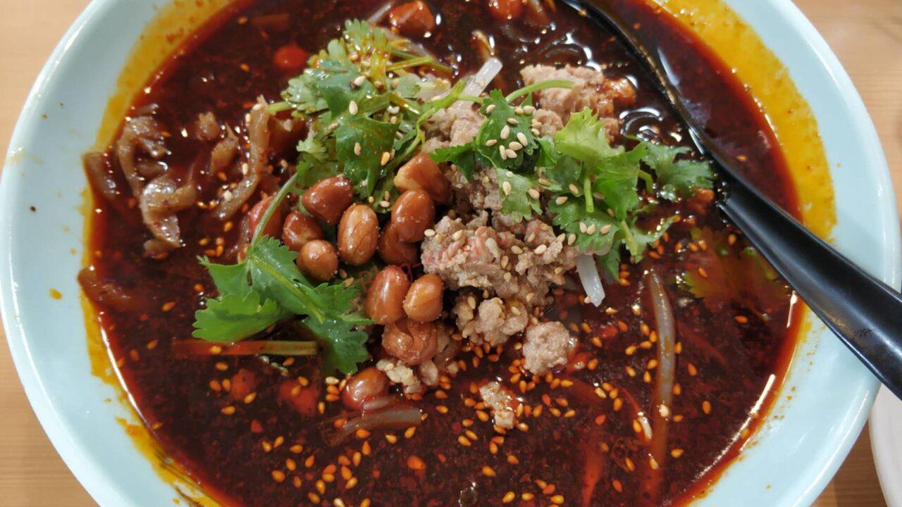 この酸辣粉の粉は太めでモチモチとコシがあります。うまいです。酸っぱ辛くてスパイシーなスープがよくからみます。